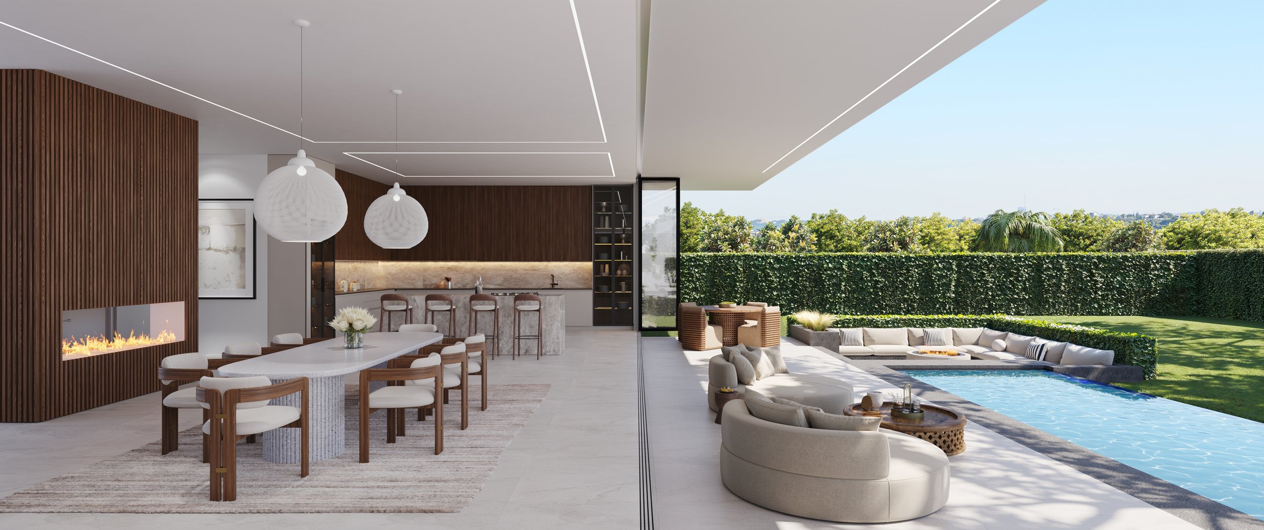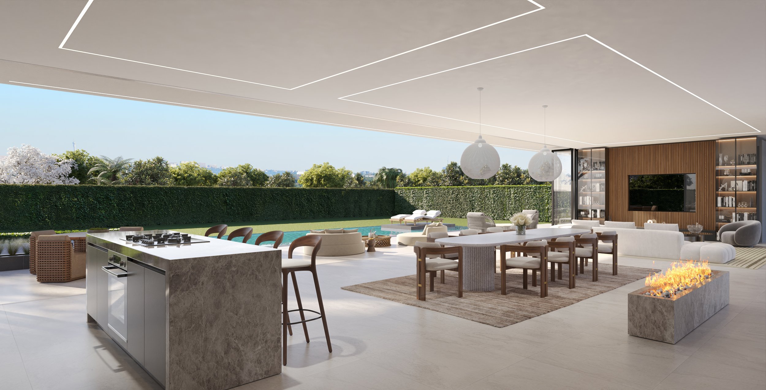 The elegant lounge and dining room open effortlessly onto a covered patio, overlooking a sparkling pool, boma, and beautifully landscaped garden—perfect for seamless indoor-outdoor entertaining.